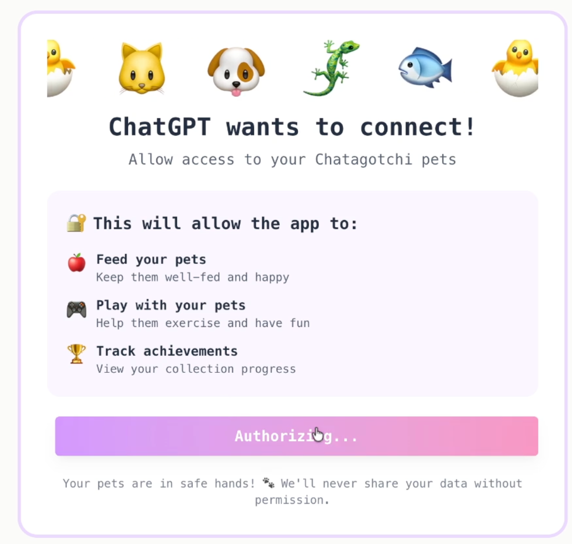 Now for the fun part! Max built a Chatagotchi app—basically Tamagotchi for modern AI chat—using the OpenAI Apps SDK and MCP protocol, all securely wired up with OAuth.
