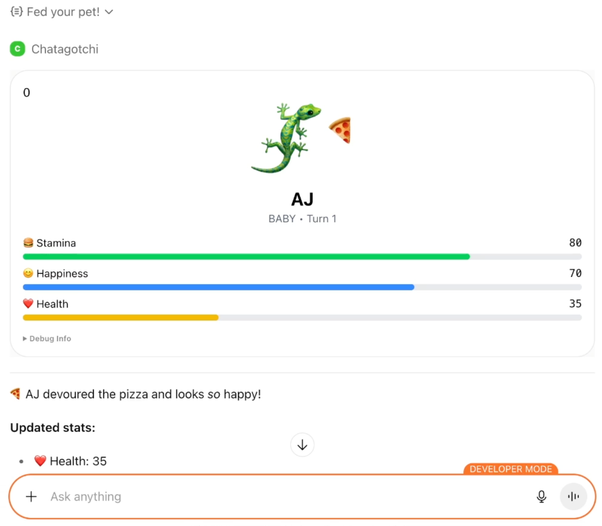 Max’s Chatagotchi widget in action inside ChatGPT, showing custom UI, game state, and seamless OAuth flow---