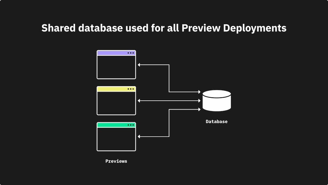 This is probably the biggest change you will see in the next 5 years when it comes to serverless databases. It is very common to when using to preview deployments for your frontend applications to only use a single database like below. This is a huge step forward from hitting any type of production database, but when previewing the deployment you might want to make new backend changes as well for this specific preview without affecting all other previews that other preview branches are working from.