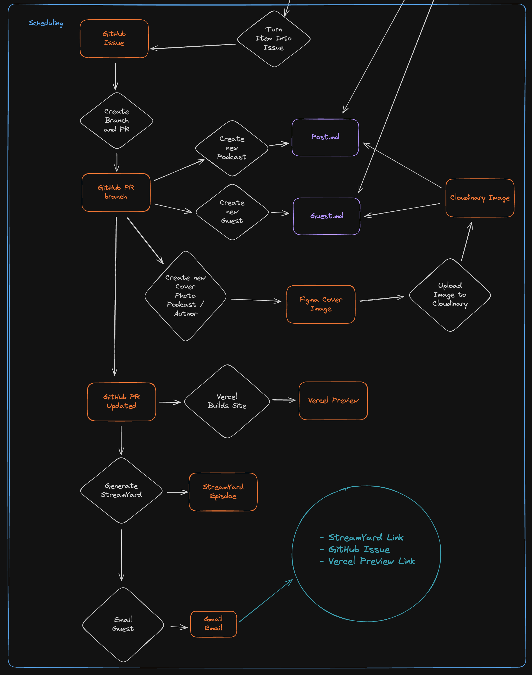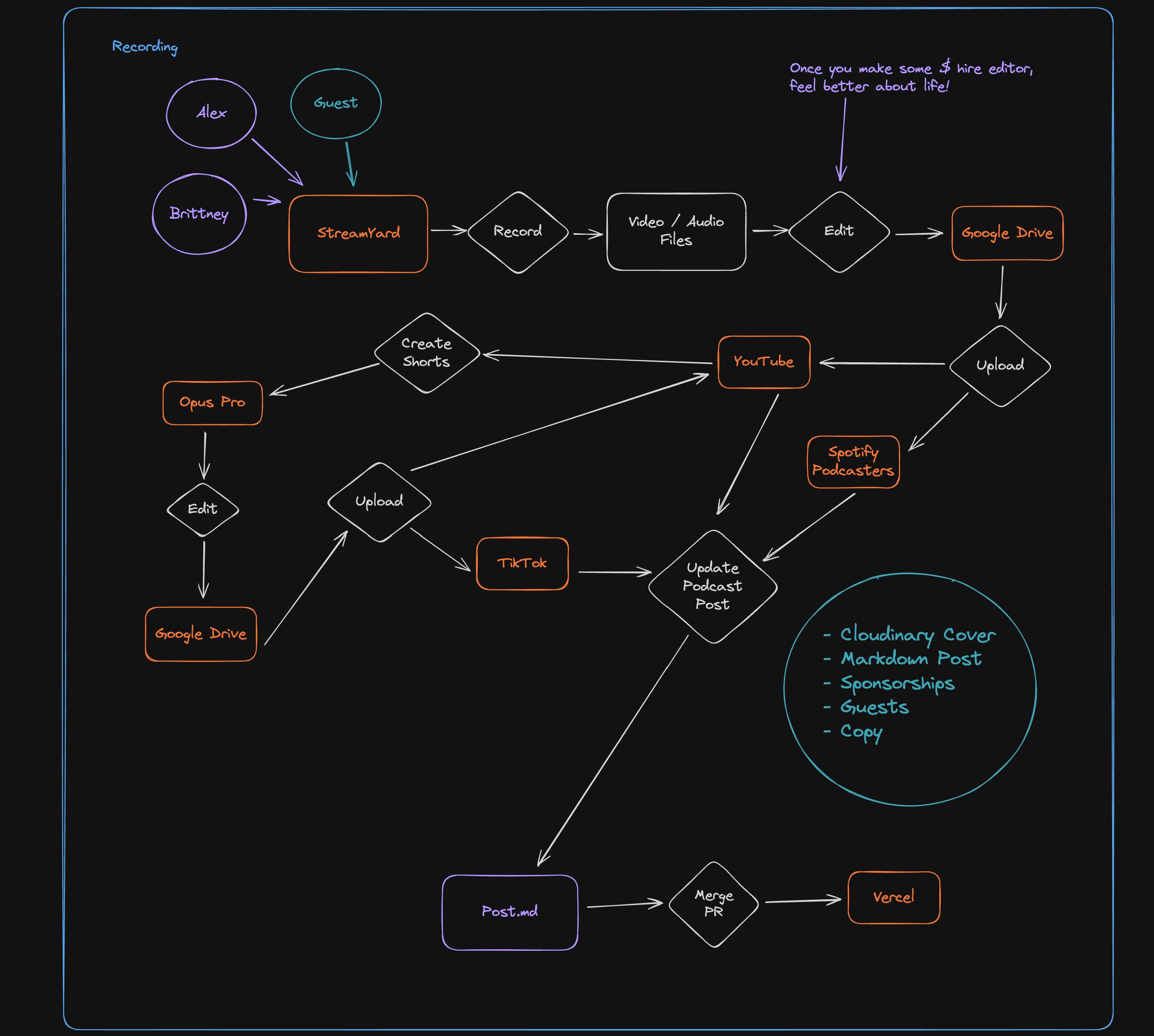 I learned very early on that life happens and you need to be flexible. When I first started out, when I secured a guest I would then make that something like season 3 episode 10 on every piece of digital asset. From the project, the the post, to the media. This was a HUGE mistake! People forget that they scheduled, have family emergencies, Brittney or I both get booked into doing a conference. Life just takes hold and you can't be so concrete on these things. This is where tools like GitHub and Vercel Previews make things super easy. I can share a draft of the episode with the guest and they can even make their own pull request to update as they see fit.