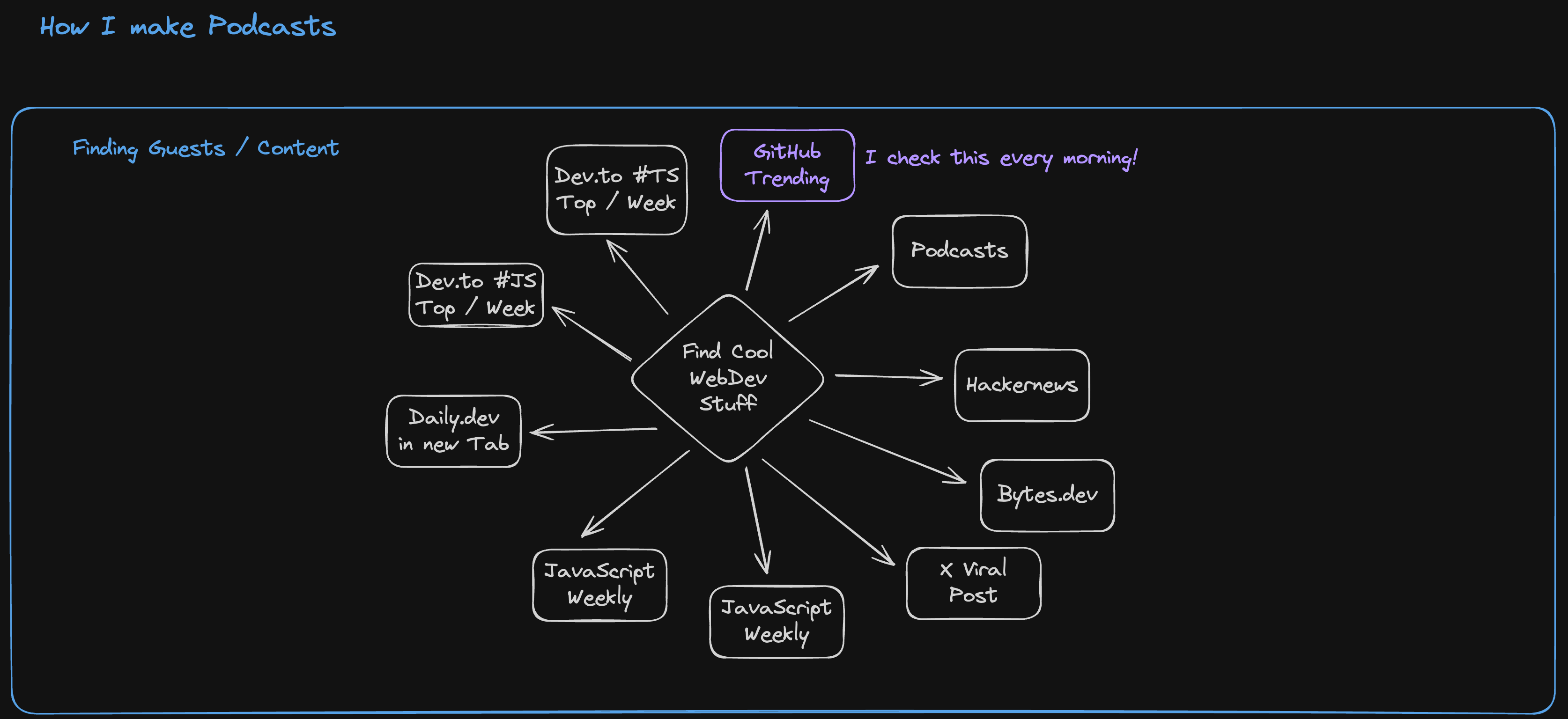 Every morning, without fail, the journey begins with a hunt for content. I check trending GitHub repositories to stay updated with the latest in tech. Websites like GitHub Trending, Dev.to, Daily.dev, Hacker News and of course web development podcasts are what I use to scour for top articles on JavaScript and TypeScript. This isn't casual browsing; it's a deliberate search for engaging topics that could spark a lively discussion on the next podcast episode.