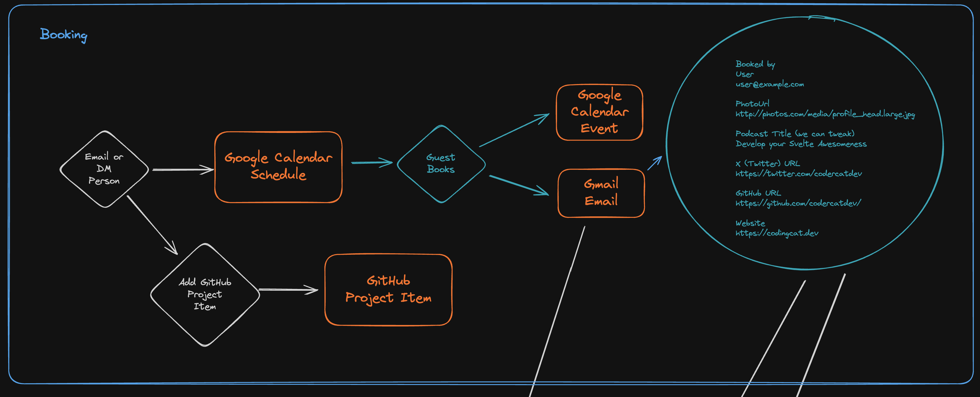 Once the content is identified, it's time to schedule and book guests. I use tools like Google Calendar Appointment Scheduling to invite the guests to reserve a spot for either Code with Codingcat.dev or CodingCat.dev Podcast. I then utilize GitHub Projects to organize guests, turning potential topics into scheduled episodes. This part of the process is crucial — it's where the abstract ideas floating in the digital ether (aka Alex's head) begin to crystallize into concrete plans.